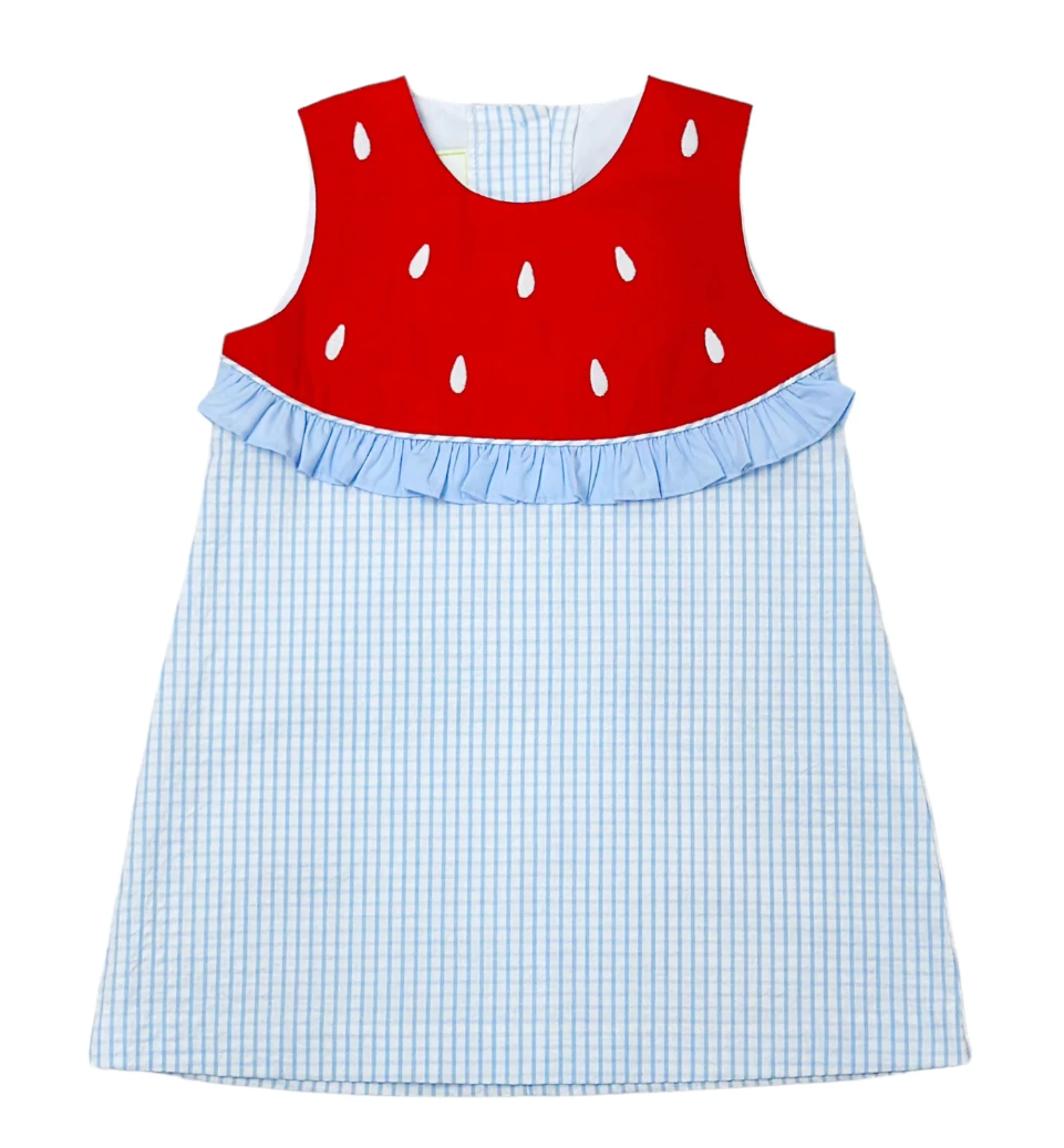 Summer style has never been sweeter with the Watermelon Hayden Ruffle Dress! Made with seaside windowpane seersucker, this dress is perfect for your girl. Get ready for some beach vibes and playful adventures.