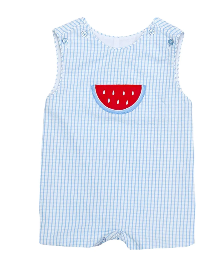 Seaside windowpane seersucker with an adorable embroidered watermelon for your little one!