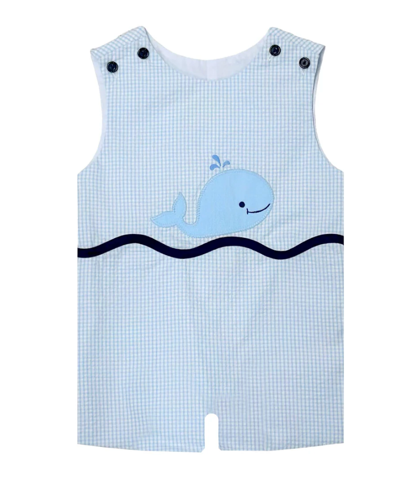 Summer style has never been cooler with this whale shortall! Made with seaside windowpane seersucker, this shortall is perfect for the summer. Get ready for some beach vibes and playful adventures.
